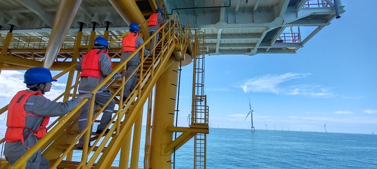 海上作業遠比我想象的要困難。突然而起狂風,讓海浪如洶涌的巨獸般肆意拍打著升壓站的基座,仿佛要將它吞噬。當我們要從船上跳到升壓站平臺時,海浪讓船體劇烈起伏,與平臺之間的間隙只有狹窄的兩米。那一刻,“兩秒鐘的反應時間”不再是紙面規定,而是生死時速的考驗。